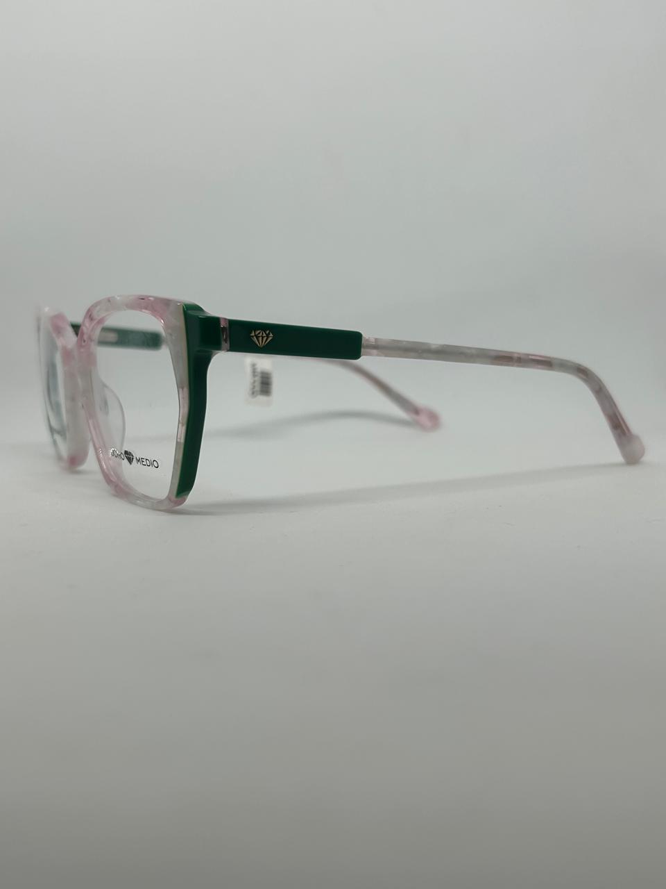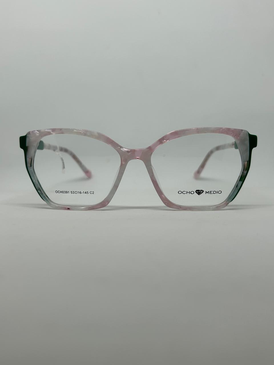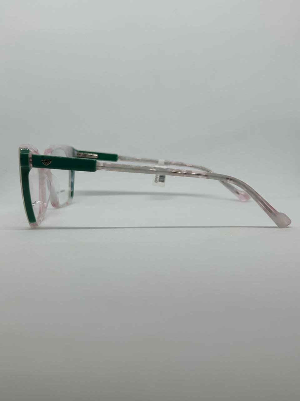 Montura femenina de diseño moderno con un delicado efecto marmolado en tonos rosados, combinada con varillas en contraste verde que aportan un toque sofisticado y original. Su forma suavemente angular realza las facciones y brinda un equilibrio perfecto entre elegancia y estilo contemporáneo.