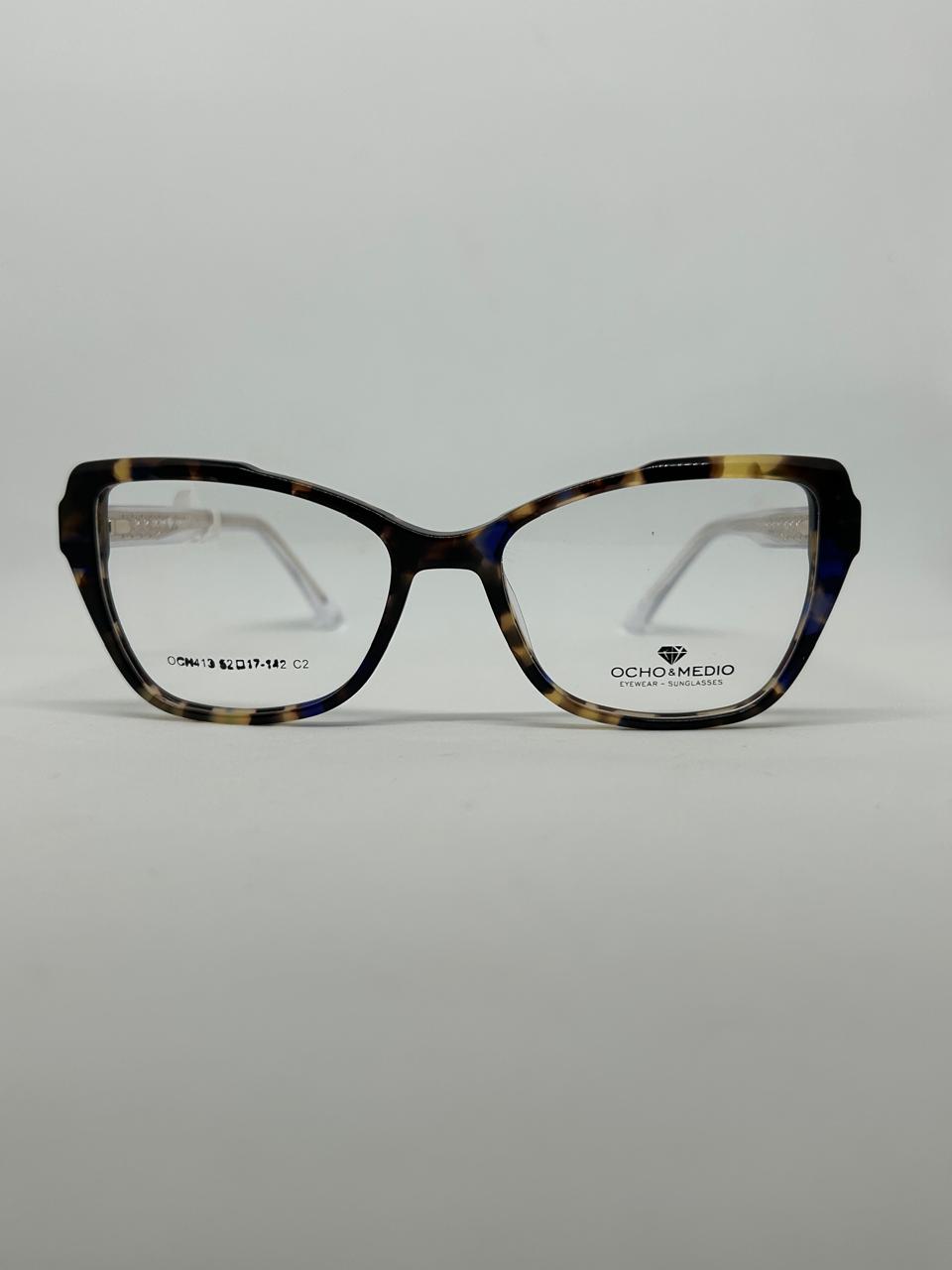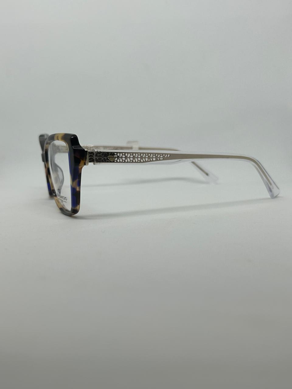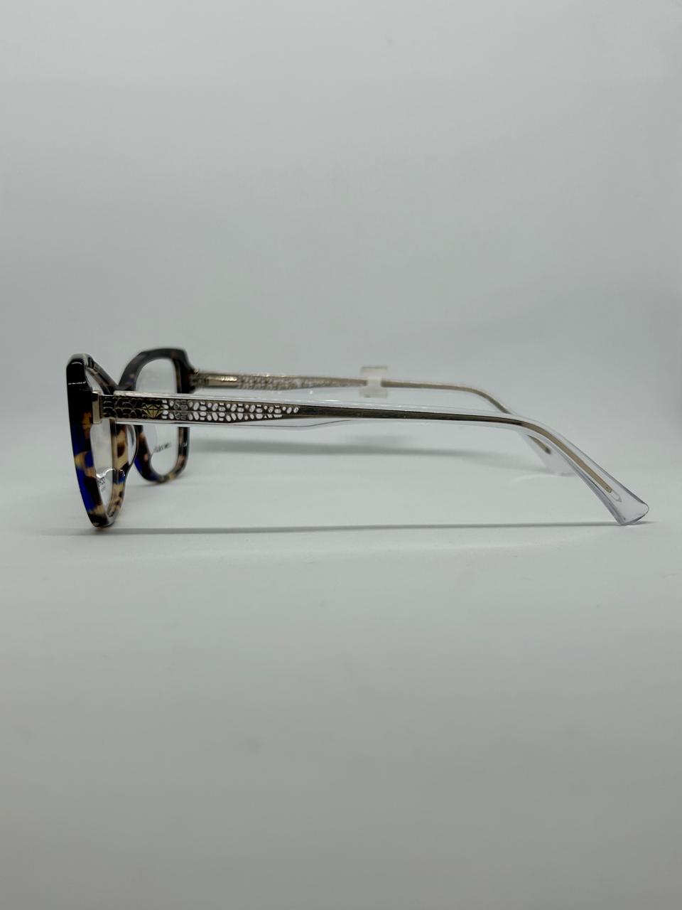 Montura femenina de estilo elegante y sofisticado, con frente en acabado carey que combina tonos oscuros y detalles sutiles en azul, aportando profundidad y carácter al diseño. Sus varillas metálicas con grabado decorativo añaden un toque refinado y delicado, ideal para mujeres que buscan un accesorio distintivo y de alta estética. Es un modelo ligero, cómodo y perfecto para quienes desean resaltar su estilo con un diseño clásico renovado.